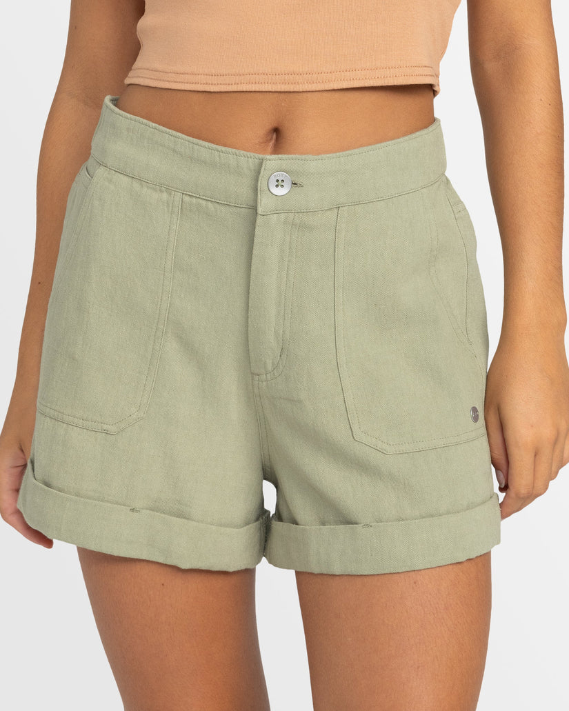 Slip into the Alta Casual Shorts from ROXY and let your laidback style shine. Crafted from a heavyweight cotton canvas, these shorts offer a relaxed fit and a hint of stretch for all-day comfort. With two front patch pockets and two back pockets, you'll have ample storage for your essentials. The rolled-up hem adds a casual, carefree vibe that's perfect for weekend adventures. Featured here in the Oil Green colorway.