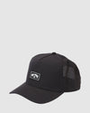 Product: Medium profile structured 5-panel trucker hat with laser-cut back with a palstic snap closure with wordmark flag label and curved brim