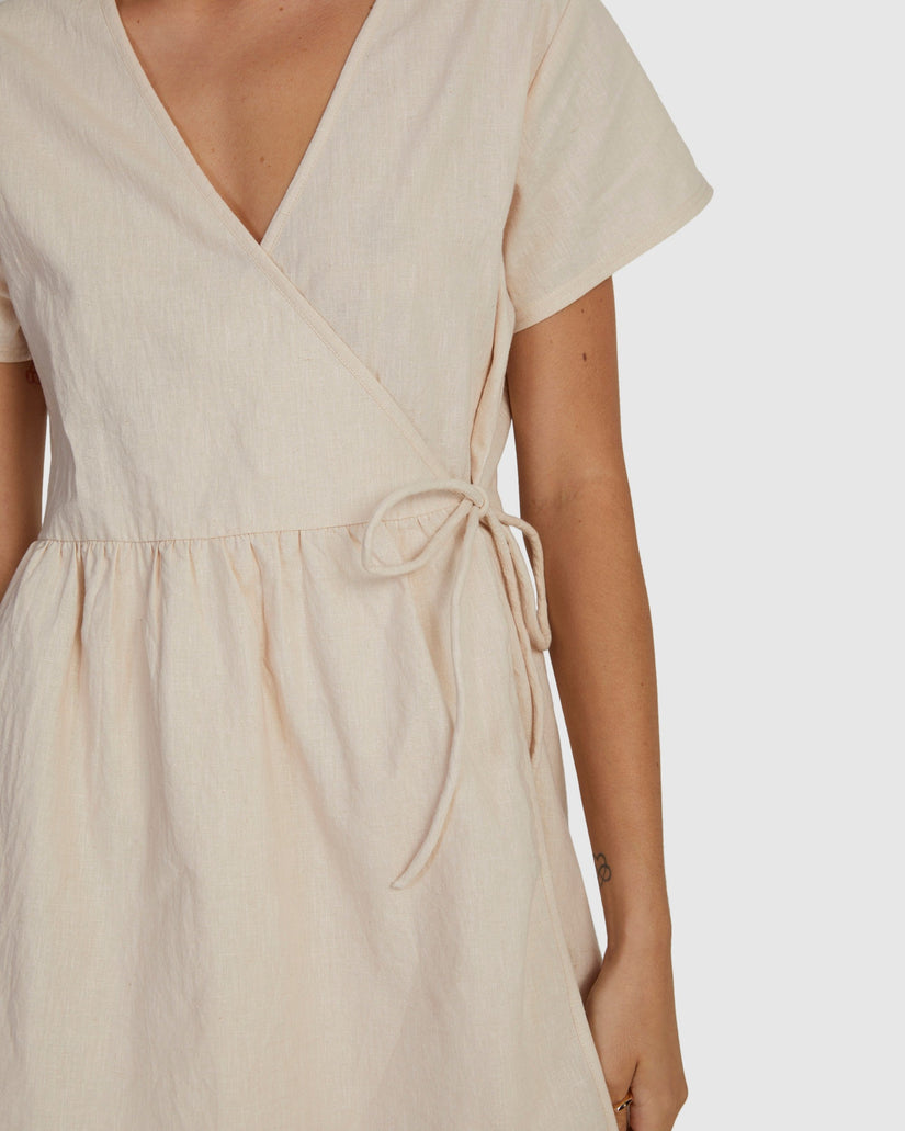 Cross over wrap dress with self fabric tie and branded metal logo badge