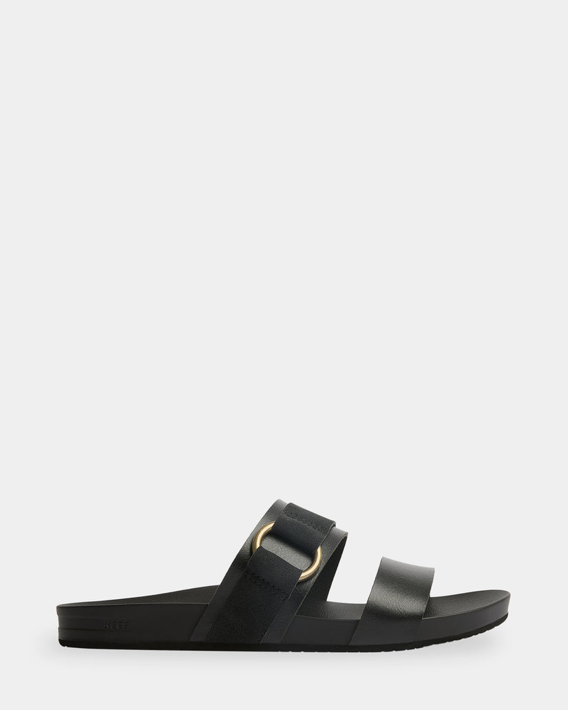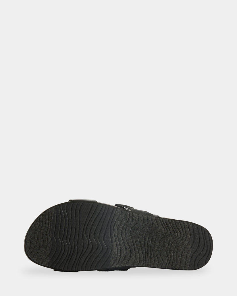 Features:UPPER: Super soft unlined PVC-free vegan leather two-strap slide with metal buckles and recycled hardware detail