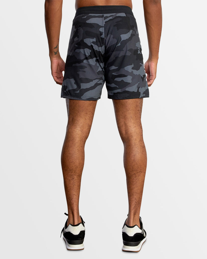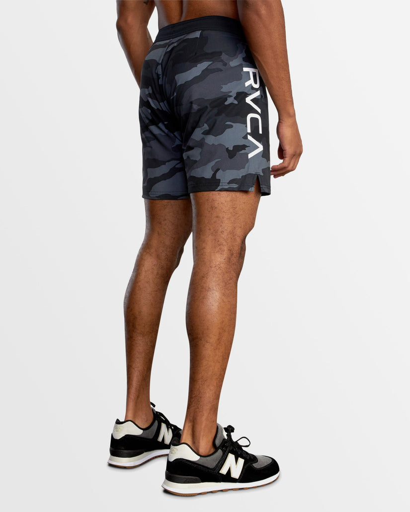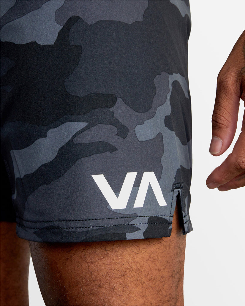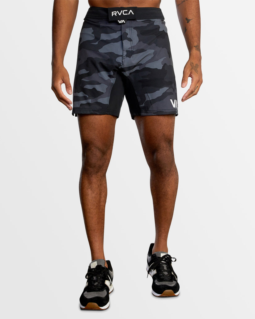 the rvca fight scrapper elastic walkshorts 17" are made from recycled 4-way stretch with an elastic drawcord waist and hook & loop closure at the fly. designed with split hem for extra flex, these men's performance shorts are topped with rvca branding throughout.
