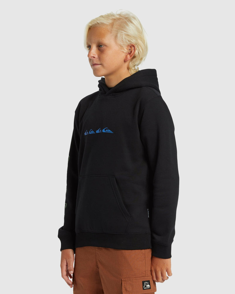 Stay geared up for any occasion, and every adventure with this Youth Boy's graphic hoodie. Made in super soft blended cotton, it features a kangaroo pouch pocket, ribbed cuff details, and a fresh range of colors and graphics giving it that signature Quiksilver style.