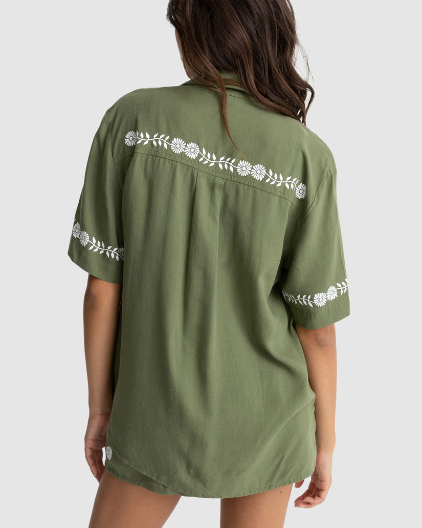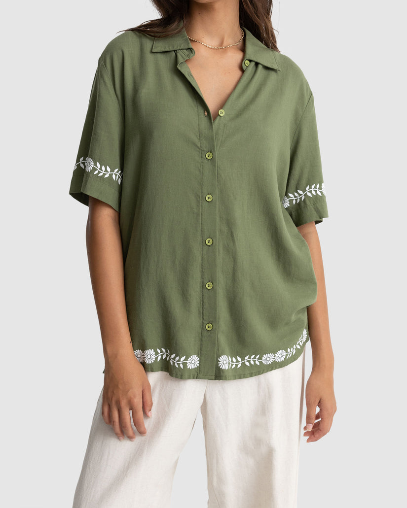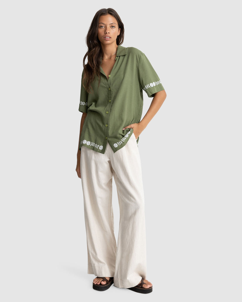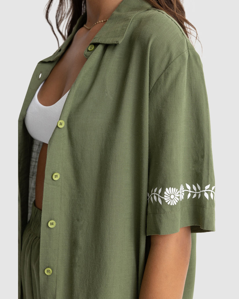 Comfort and style in the same breath, the Juno Short Sleeve Shirt is fabricated from a lightweight linen rayon blend in an olive colourway. Designed to be relaxed fitting with a straight hem and custom placement print detail.