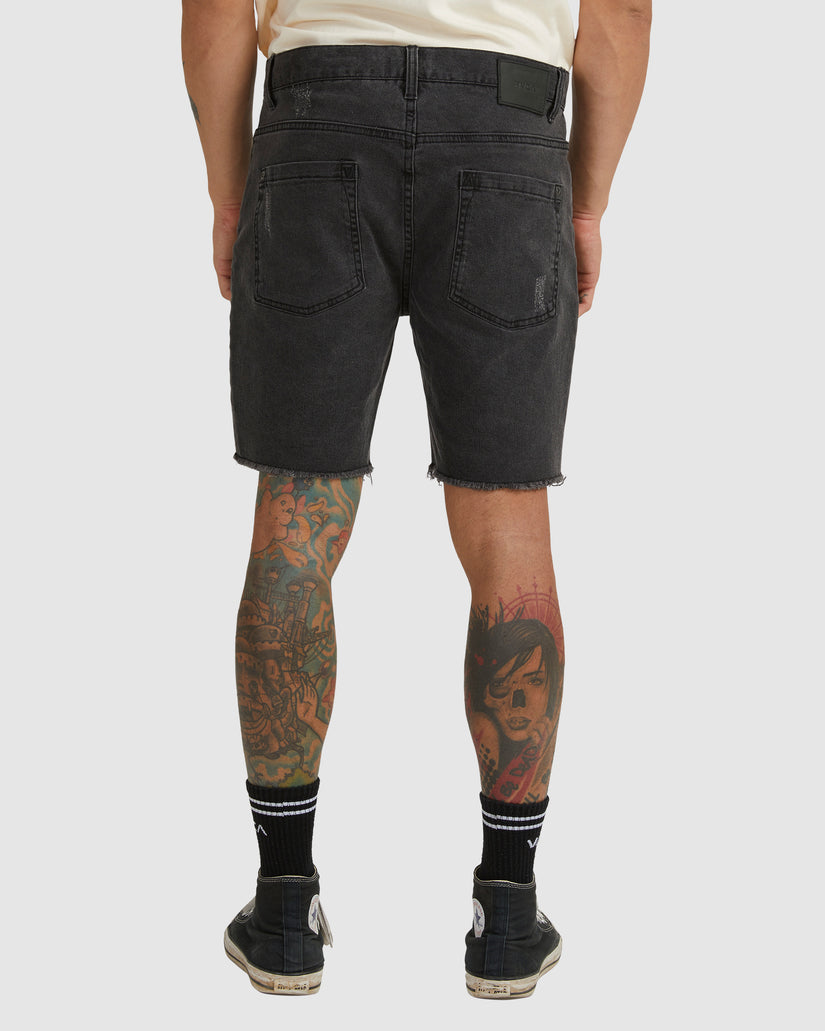 the rvca rockers walkshorts serve up a deep cut with a classic cut-off hem and vintage wash. these throwback shorts balance a vintage wash with a modern, tailored fit. built with classic 5-pocket styling, these jean shorts are finished with logo details on the hardware's and a rvca woven label at the coin pocket.