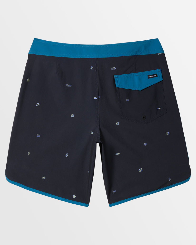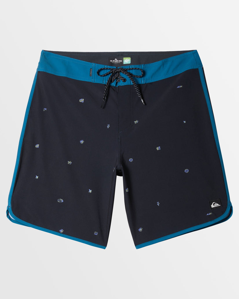 Enhanced your aloha with Quiksilver's Scallop Boardshorts, featuring a paradise island print and a scalloped hem for a retro look. Crafted with Remade Surfsilk, an innovative fabric crafted from partially recycled material that feels super soft on the inside and extra strong on the outside, these 18" swim trunks are topped with a secure drawcord closure and a back pocket.