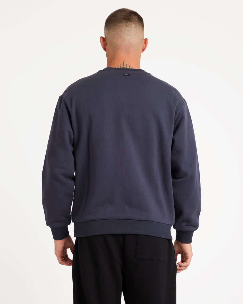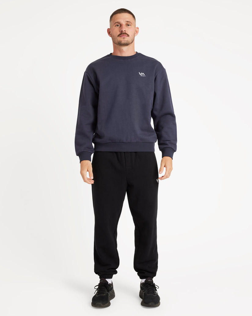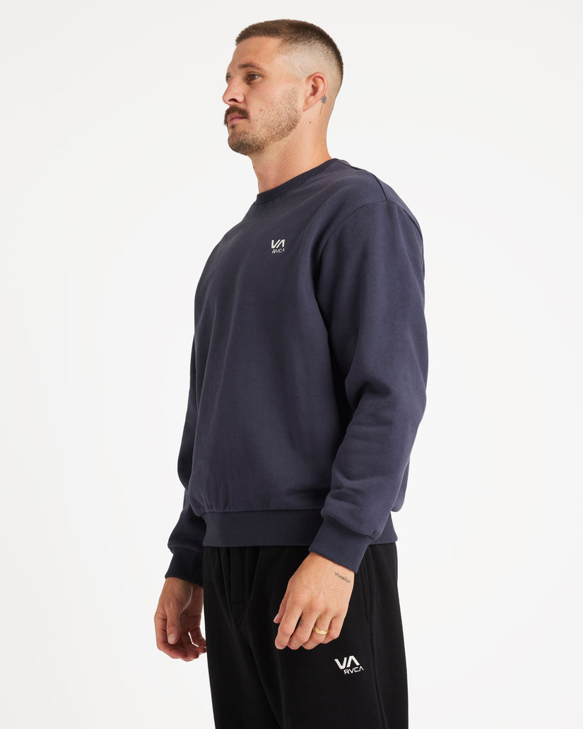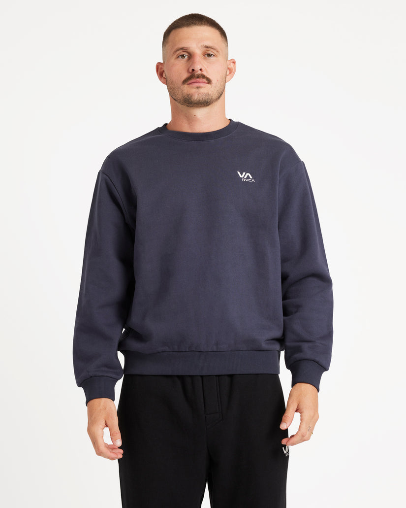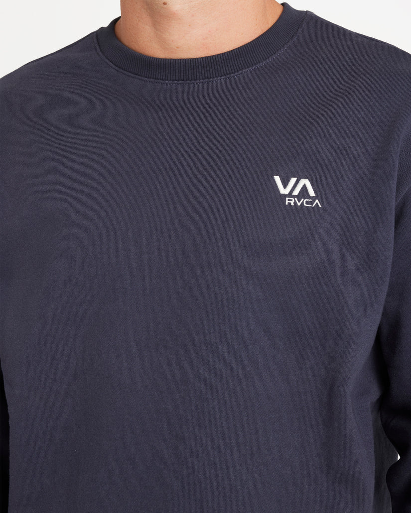 crafted from combed cotton and french terry fabric for a premium soft feel, the rvca va essential crew sweatshirt offers a relaxed fit with ribbed cuffs and a logo hit at the chest. featured here in the indigo colorway.